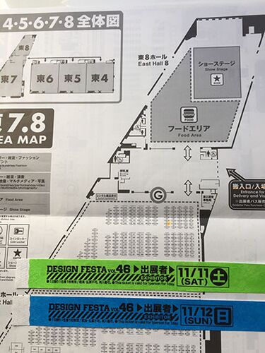 どんな準備が必要なのか、全くよくわからないまま見切り発信した友人達とのデザインフェスタ出展。 先日、事務局から場所と出展者パスが届く。今回から腕巻きタイプになったらしい。 マーカーのところが私たちの場所だ。 こうなると、いよいよブースの展示方…